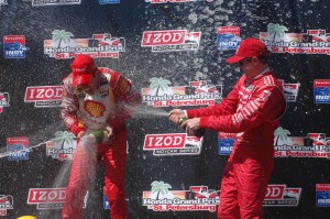 Scott Dixon (left) runner-up in the 2012 edition of the Honda Grand Prix of St. Petersburg sprays Champion Helio Castroneves with champagne (photo by Rodney Meyering / Rocket Sports & Entertainment)