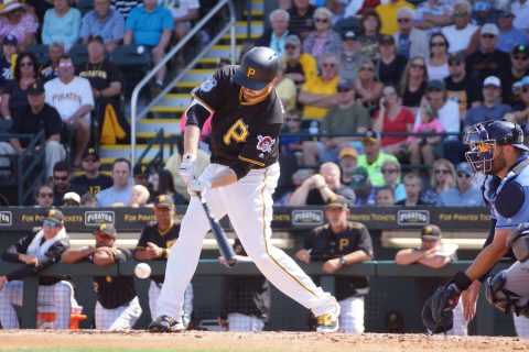 The Pirates David Freese singles to right driving in the first run against the Rays on Friday at LECOM Park in Bradenton (EDDIE MICHELS PHOTO)